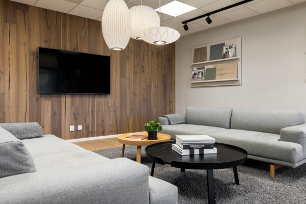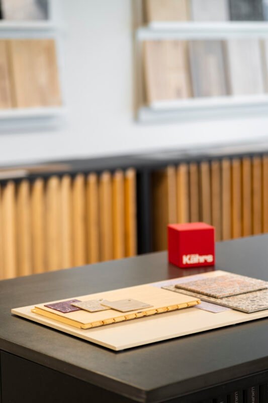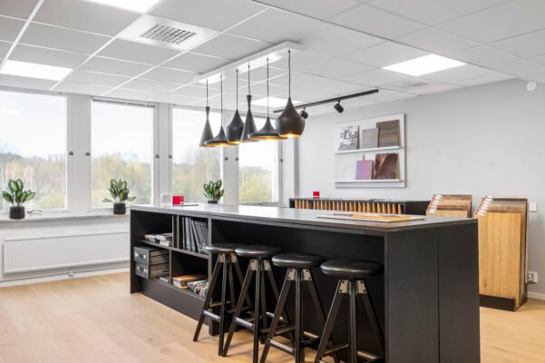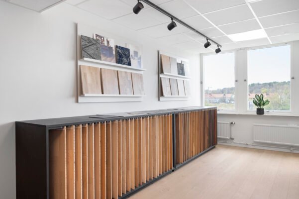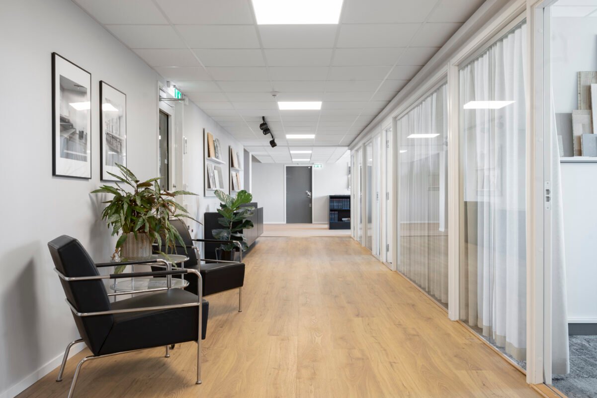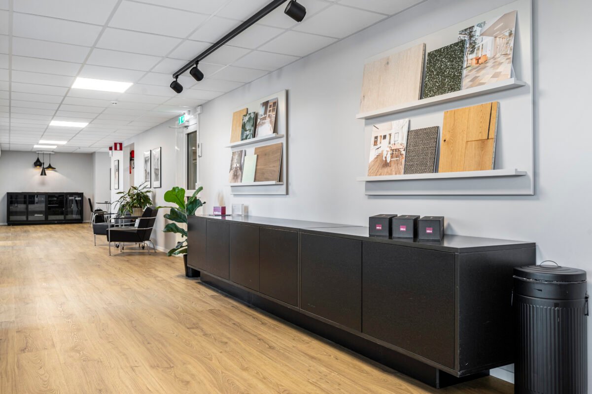 We decided to utilize the great opportunity of a new office and showroom and install a mix of different floors to easier present Kährs great product mix to customers. Disvocer a mix of hard wood, Luxury Tiles and textile.