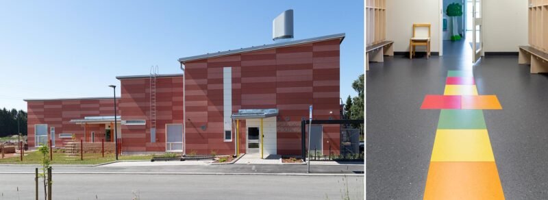 Pikkureppu is a new nursery school in western Pori, next to the Vähärauma School. Upofloor Zero contract sheet flooring is used in the building. Different patterns are created using the various shapes and colours. The use of bright colours gives the space a perky atmosphere.