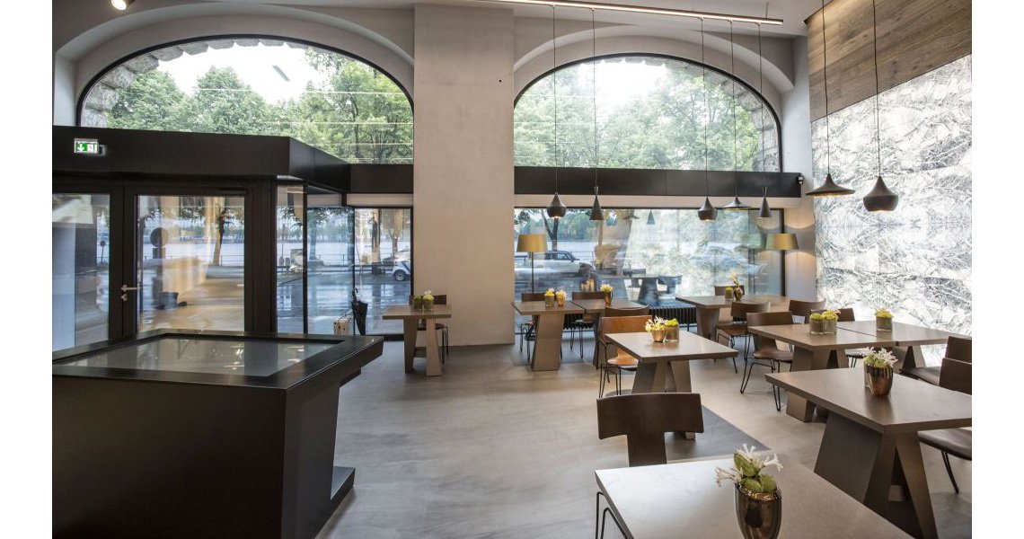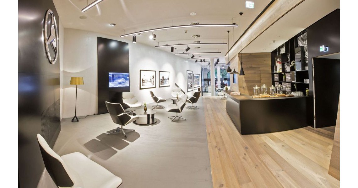 A new concept to an automotive showroom has landed in Ballindamn, Hamburg. The new showroom features leading technology coupled with traditional comforts to create a new shopping experience. Touch screen displays with configurator tools and personal consultation staff complete the interactive package of this showroom, whilst a centered bar and lounge area outfitted in Kährs Oak Sture adds traditional comfort to ease the mind from technological advances.