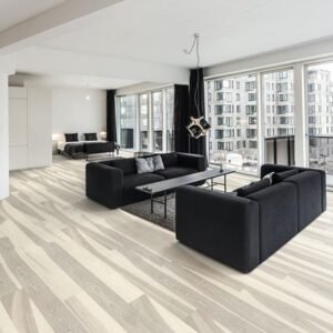 The white structure and semi-transparent stain on this single-strip ash floor from the Lux Collection balances the light and dark contrasts in the wood, allowing the warm ash tones to softly filter through. Four-sided micro-bevelling at the edging ensures a classic full plank look and feel. Each board is carefully brushed to perfection to enhance the natural character of the grain. The light-absorbing, ultra-matt lacquer finish creates the impression of newly sawn timber, effectively eliminating glare while protecting the wood from daily wear.