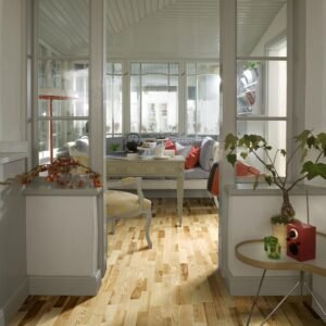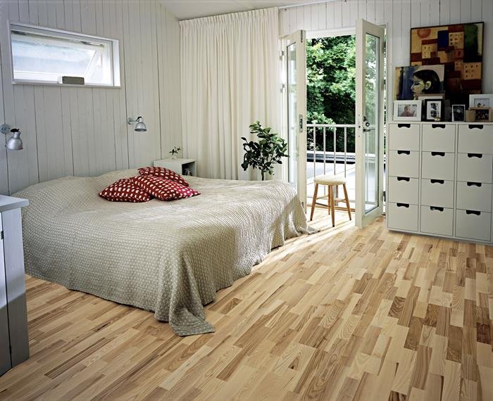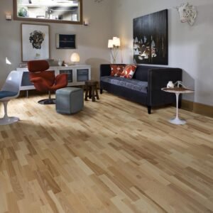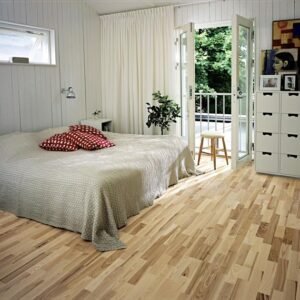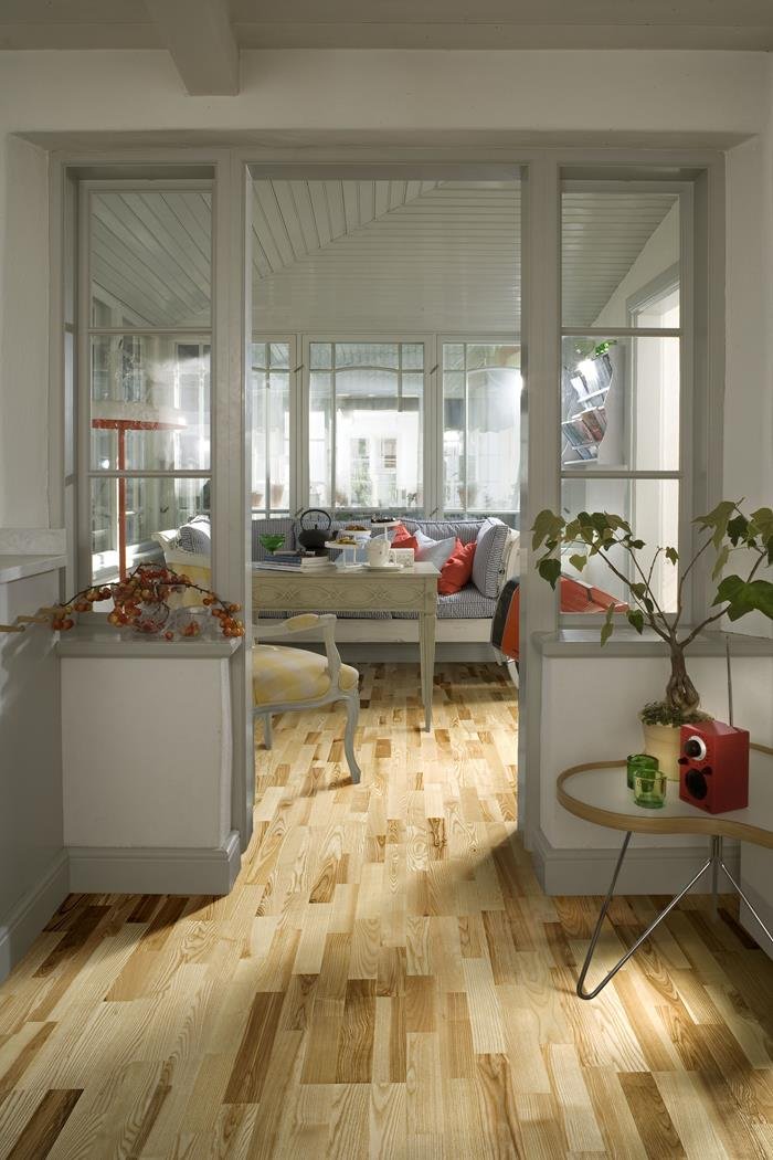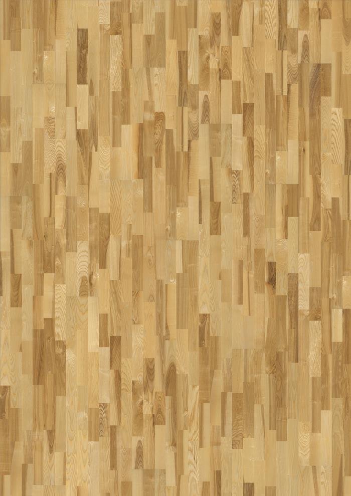 The blonde hues found in this 3-strip ash floor from the Nordic Naturals Collection range from amber honey to vanilla cream. To create this lively effect, lighter surface wood has been mixed with darker core wood.
