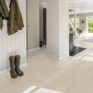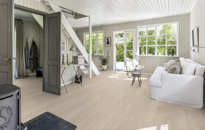 A milky, creamy opaque light colour with memories of sandy tropical beaches. Coconut cream wide is a single-strip stained oak floor from the Life Collection. A calm wood collection with few knots and an authentic look and feel. Four-sided microbevelling at the edges ensures a classic full plank look. The innovative matt lacquer finish eliminates glare while protecting the wood from daily wear.