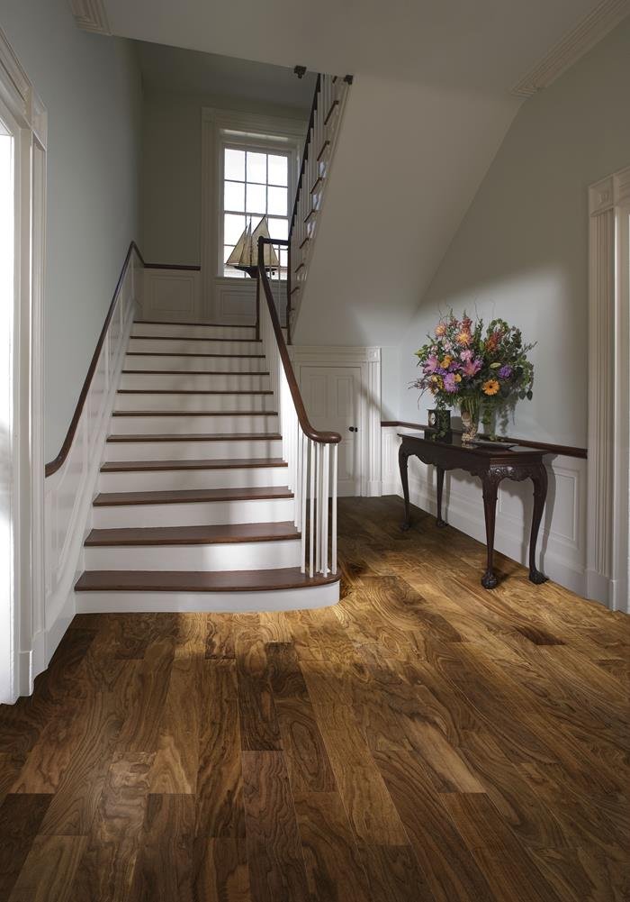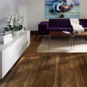 The dark grain of these luxurious walnut boards in this single-strip floor from the Unity Collection is accentuated by the lighter tones of the wood. The silk lacquer finish gives the floor a polished appearance bringing out the natural character of the timber. The even finish protects the wood from daily wear, without adding artificial shine. Four-sided bevelling at the edges ensures a classic, full plank look and feel.