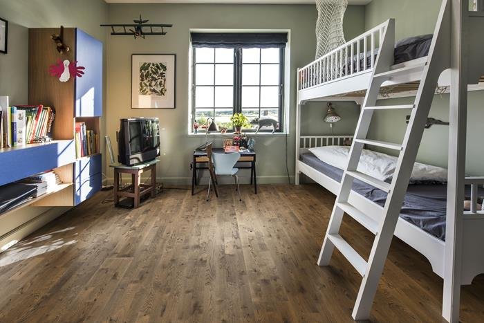 The warm hues that permeate this 3-strip oak floor from the Harmony Collection create a burnished expression, which is punctuated by naturally occurring knots and colour variations in the timber. Each board is carefully brushed to bring out the character of the grain and highlight the texture of the wood. The matt lacquer finish eliminates glare while protecting the wood from daily wear.