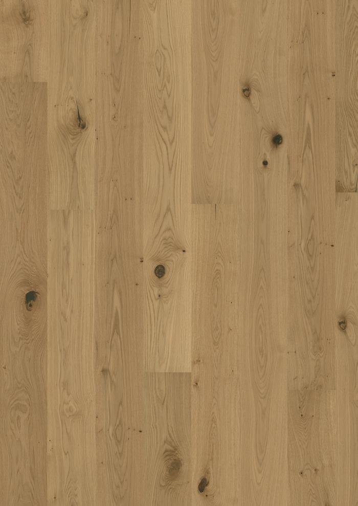 In Oak Aster the natural oak is left to shine in all its own glory with no staining, allowing the warm colour of the oak to penetrate the oiled surface uninhibited. Each board is carefully brushed, accentuating the natural wood grain while softening the texture, knots and cracks. Any contrast in colour are purely natural, letting the raw material speak for itself. Oak Aster is also available in a matt lacquered version.