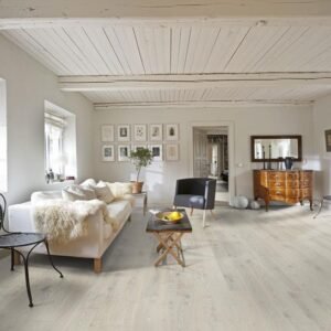 The powder white finish on this single-strip floor from the Element Collection enhances the natural colour variances in the white oak and emphasises the bevelling with lustrous detail. Each board is carefully brushed to bring out the character of the grain and highlight the natural texture of the wood. Four-sided bevelling at the edges ensures a classic full plank look and feel. The matt lacquer finish eliminates glare while protecting the wood from daily wear.