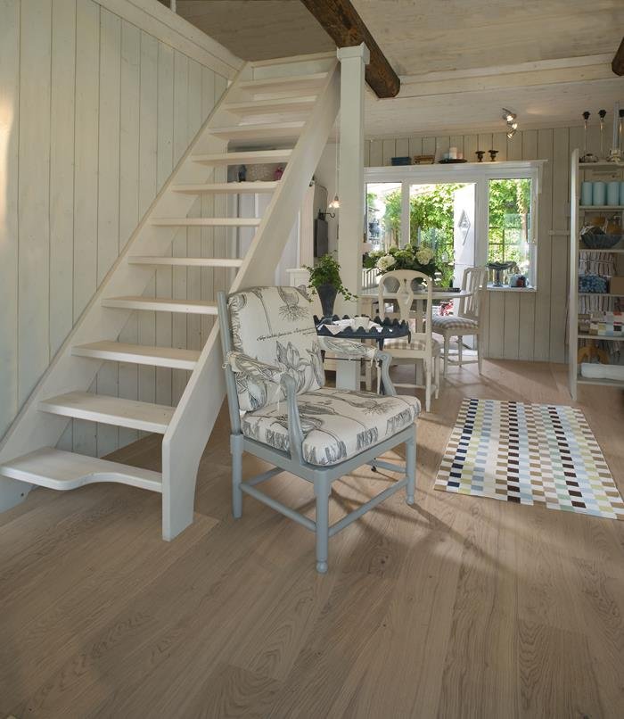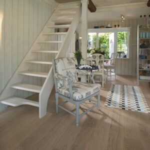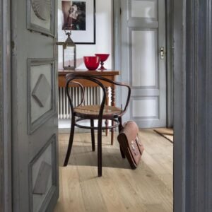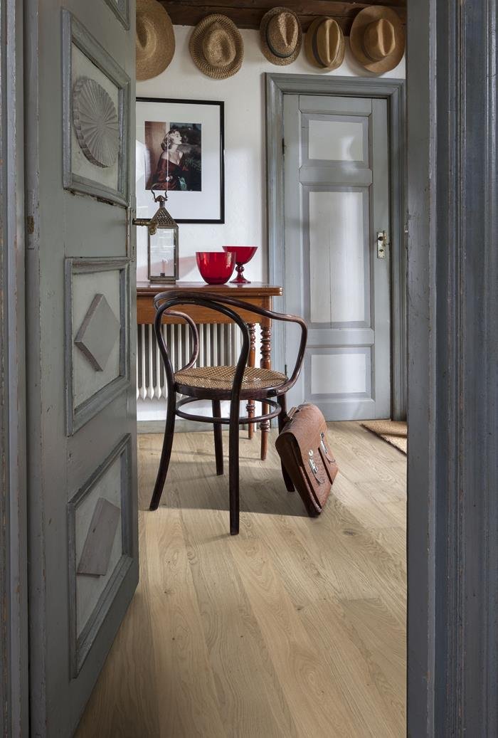 This single-strip oak floor from the Sand Collection features warm butterscotch undertones, punctuated with naturally occurring knots for a lively expression. The wearing side of each board is taken exclusively from a single piece of wood, capturing the true form of the timber. The matt lacquer finish eliminates glare while protecting the wood from daily wear.