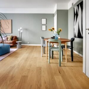 Oak Dahlia Oiled showcases the natural beauty of oak, untouched by stain, allowing its warm hues to shine through the oiled surface. The wood’s authentic character is highlighted by a careful brushing process that smooths the texture while accentuating the natural grain. The subtle shift in the woods’ natural nuances creates a calm, sophisticated look.