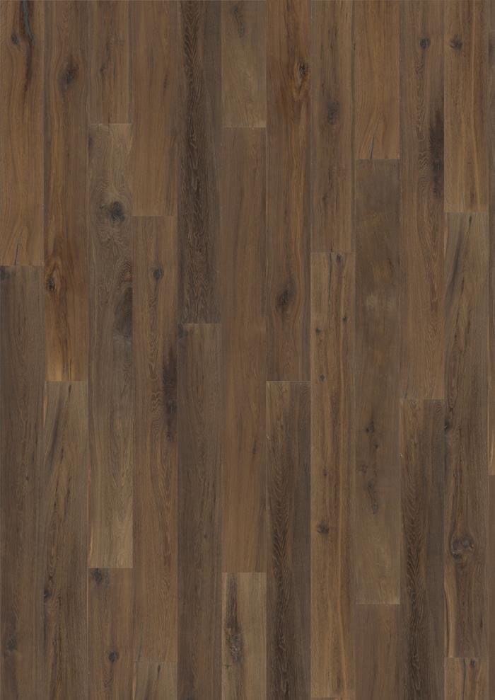 The smoked finish on this single-strip oak floor from the Artisan Collection enhances the natural colour variations for a rustic expression. Knots and cracks pepper the boards, adding depth and balancing the toasted sesame seed highlights. Each board is carefully brushed to bring out the character of the grain and highlight the natural texture of the wood. Four-sided bevelling at the edges ensures a classic full plank look and feel. Hand-scraping enhances the worn appearance of the floor.
