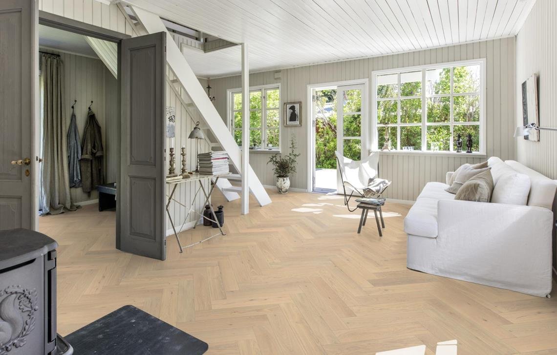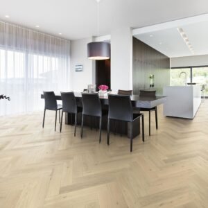 Oak Herringbone CD is a premium 2-layer parquet crafted from European oak, featuring colour variations and knots. Each bundle includes both left and right elements for glue-down herringbone installation. The generous dimension is highlighted by four-sided micro-bevelling, while the brushed and white oiled finish enhances the wood’s natural grain and texture.