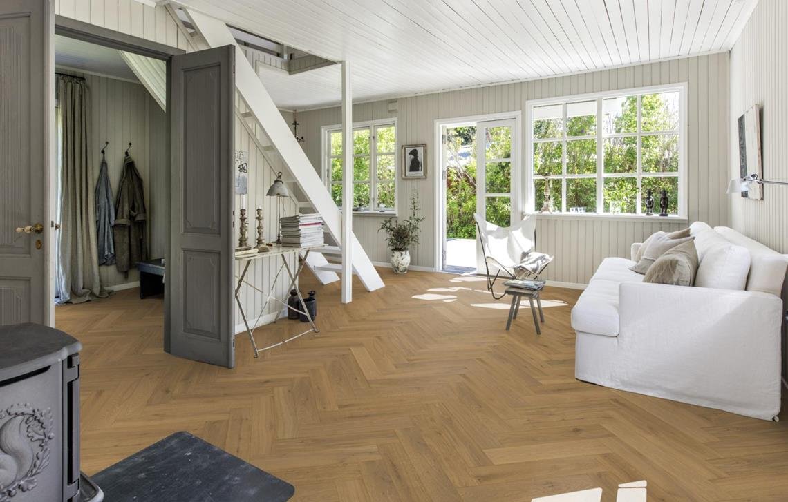 Oak Herringbone CD Smoked Grey is a premium 2-layer European oak parquet with natural colour variations and knots. Each bundle includes both left and right elements for glue-down herringbone installation. The generous dimensions are accentuated by four-sided micro-bevelling, and the lightly smoked surface is brushed and treated with tinted grey oil for a subtle, patinated look.