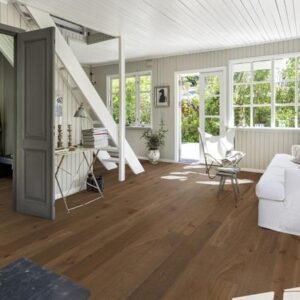 OAK JOY flooring from the Zen Collection is a versatile and elegant choice for any interior space. Its earthy brown color complements the chocolate undertones of the wood, and the single-strip design showcases the oak’s natural grain pattern, enhanced by brushing and beveling. The matt lacquer finish adds a subtle sheen while protecting against wear.