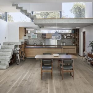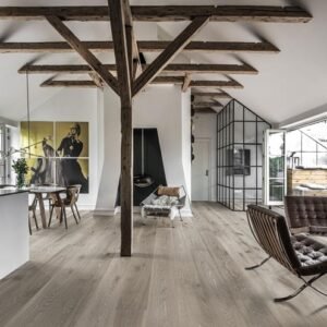 The ash grey hues in this single-strip oak floor from the Classic Nouveau Collection enhance the earth undertones and balance the natural contrasts in the wood for a sophisticated and versatile expression. Each board is carefully brushed to bring out the character of the grain and highlight the natural texture of the wood. Four-sided micro-bevelling at the edges ensures a classic full plank look and feel. The matt lacquer finish eliminates glare while protecting the wood from daily wear.