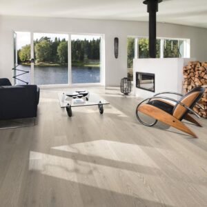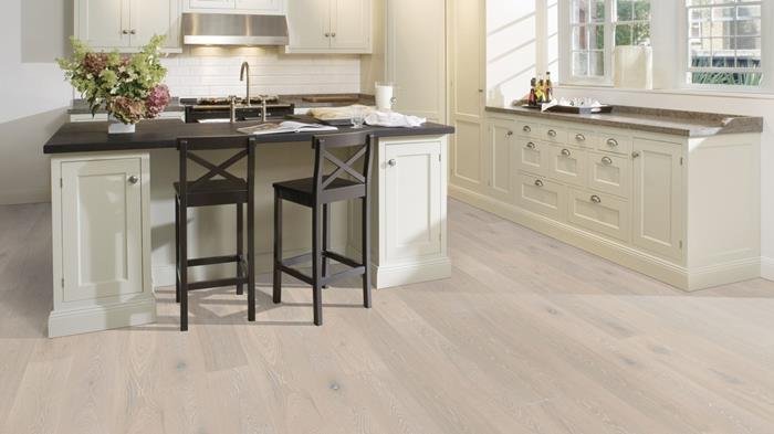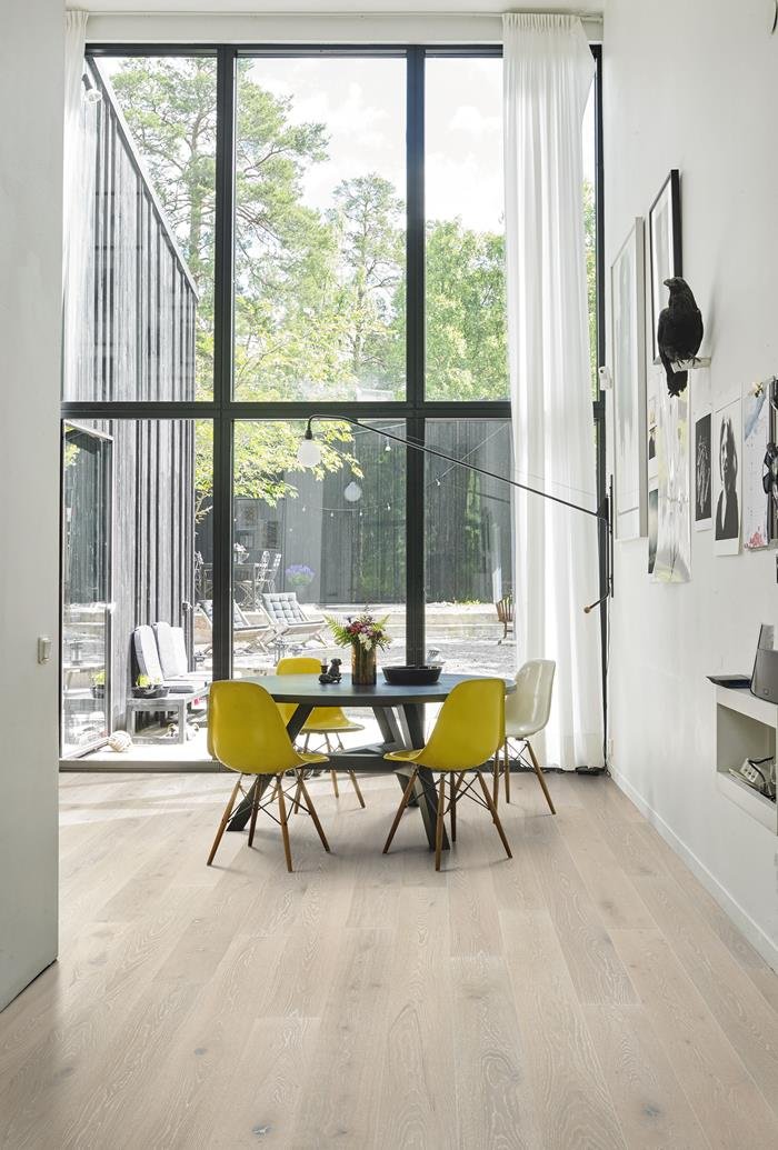 The powder white finish on this single-strip floor from the Classic Nouveau Collection enhances the natural colour variances in the white oak and emphasises the micro bevelling with lustrous detail. Each board is carefully brushed to bring out the character of the grain and highlight the natural texture of the wood. The matt lacquer finish eliminatesglare while protecting the wood from daily wear. Large knots may occur, both white and black.
