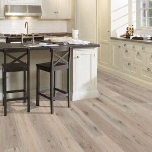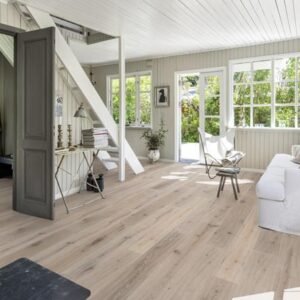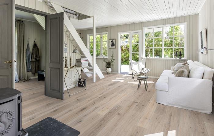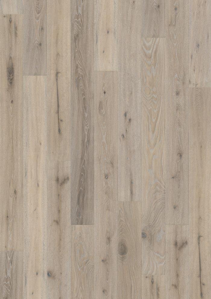 The blanched white finish on this single-strip oak floor from the Artisan Collection balances the naturally occurring colour variations, which range from heather grey to faded silver lavender, for a refined yet rustic effect. Each board is carefully brushed to bring out the character of the grain and highlight the natural texture of the wood. Four-sided bevelling at the edges ensures a classic, full plank look and feel. Hand-scraping enhances the worn appearance of the floor.