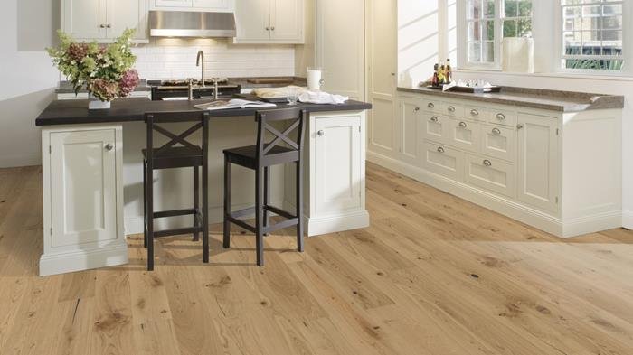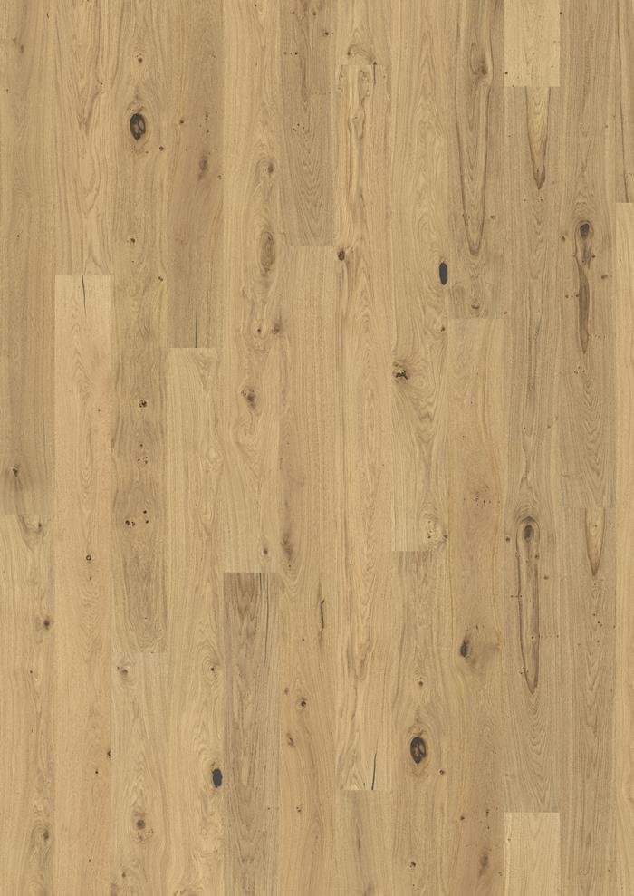 The tan hues found in this single-strip oak floor from the European Naturals Collection are complemented with knots and cracks, resulting in a timeless rustic expression. Four-sided micro-bevelling at the edges ensures a classic, full plank look and feel. Each board is carefully brushed to bring out the character of the grain and highlight the natural texture of the wood.