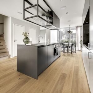 The barely-there sepia stain on this single-strip oak floor allows natural tones to show through while highlighting a characterful formation of knots. Each board is carefully brushed to bring out the grain and four-sided beveling ensures a classic full plank look.