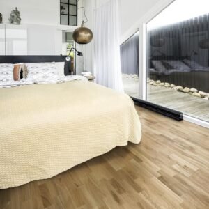 The colour variation in this 3-strip oak floor from the European Naturals Collection ranges from brown butter highlights to burnt caramel lowlights for a classic and cheerful expression.