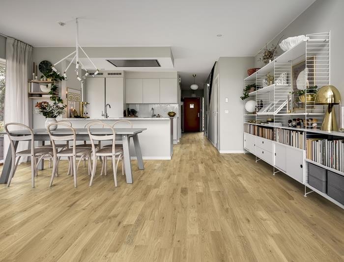 Oak Silk has a silky white stain adding a soft, slightly muted expression to this 2-strip oak floor. The natural knots add character and beauty, while the elegant format and precision milling complete this sophisticated, almost seamless, look. It is finished with a matt lacquer, eliminating glare and protecting the wood from daily wear making Oak Silk a floor of understated beauty.