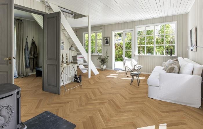 Oak Studio CD is a colorful oak floor with both color variations and knots. The product is delivered with both left and right version in the bundles for herringbone installation.