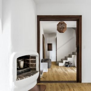The warm golden stain on this single-strip oak floor from the Småland Collection enhances the late autumn harvest tones in the wood, resulting in a lively expression and naturally balanced contrast. Each board is carefully brushed to bring out the character of the grain and highlight the natural texture of the wood. Four-sided bevelling at the edges ensures a classic, full plank look and feel. Every board is meticulously hand-scraped, which enhances the worn appearance of the floor.