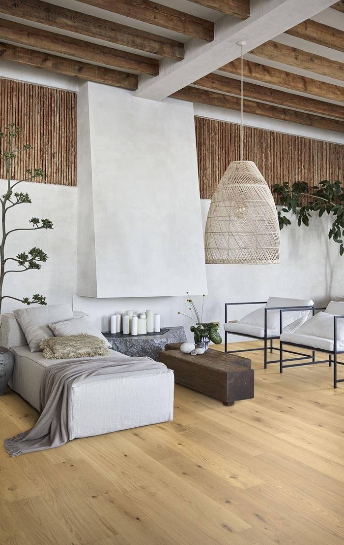 The OAK WISDOM floor’s natural bronze color and subtle matt lacquer gives it a warm and inviting look. Each board’s brushing and beveling process emphasizes the unique grain and texture, creating a tactile experience. The use of renewable natural oak adds to the flooring’s sustainability, and its warmth and character make it a timeless choice for any space.