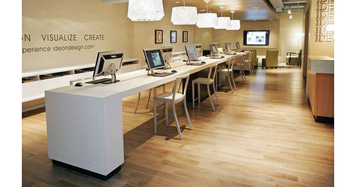 IDEON là thương hiệu của Tập đoàn Exemplis, nhà sản xuất đồ nội thất theo hợp đồng hàng đầu Hoa Kỳ cho thị trường thương mại, chăm sóc sức khỏe, khách sạn và văn phòng. Giới thiệu công cụ tùy chỉnh đồ nội thất trực tuyến đầu tiên trong ngành tại hội chợ thương mại Neocon ở Chicago, gian hàng của IDEON cần truyền tải thông điệp về thiết kế tiên phong. Gỗ sồi Ipanema màu trắng là sự kết hợp hoàn hảo với thiết kế nhẹ nhàng, rộng rãi của khu vực.