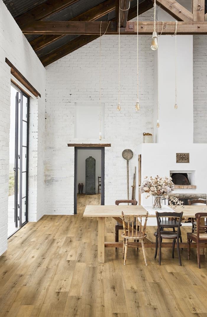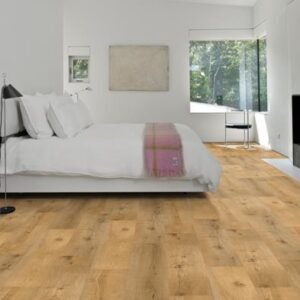 Những tông màu ấm áp, tối hơn, tương phản với màu gỗ sồi mật ong đặc trưng cho màu sắc của sàn Tobiano. Các đặc điểm tự nhiên như mắt gỗ và vết nứt nhấn mạnh vẻ mộc mạc chân thực của sàn gỗ, góp phần tạo nên một không gian nội thất ấm cúng và thư thái.